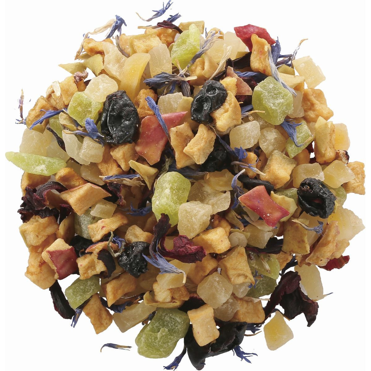 有機ドライアップル(オーストリア製造)、加糖ドライパイナップル、加糖ドライマンゴー、加糖ドライキウイフルーツ、加糖ドライブルーベリー、有機ハイビスカス、コーンフラワー/香料、クエン酸、保存料(亜硫酸塩)、着色料(黄4、青1)